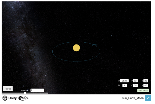 Check this embedded WebGL rendering of the Sun-Earth-Moon system created with Unity. WebGL versions can be played in any modern web browser. Click the image to see the WebGL animation.