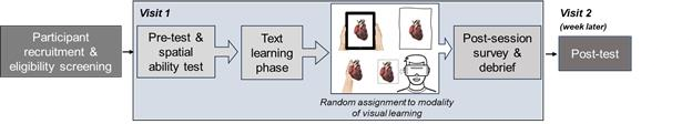 After recruitment, the participants come in for a first visit where they take a knowledge pre-test and paper folding test (spatial ability test). Next, they read text about the cardiovascular system and are randomly assigned to one of four heart modalities(paper, 3D printed plastic, AR tablet, or AR headset). The four modalities display the ‘same’ heart and are as similar as possible. During the 15-minute visual learning phase, the participants hear some audio about the anatomy of the heart and participants are free to ‘explore’ the heart. Following this, there is a post-sessions survey to gauge whether participants were interested and motivated by the model as well as to assess any motion sickness. About a week later the participants return for second visit to take a post-test, which includes conceptual and spatial questions.