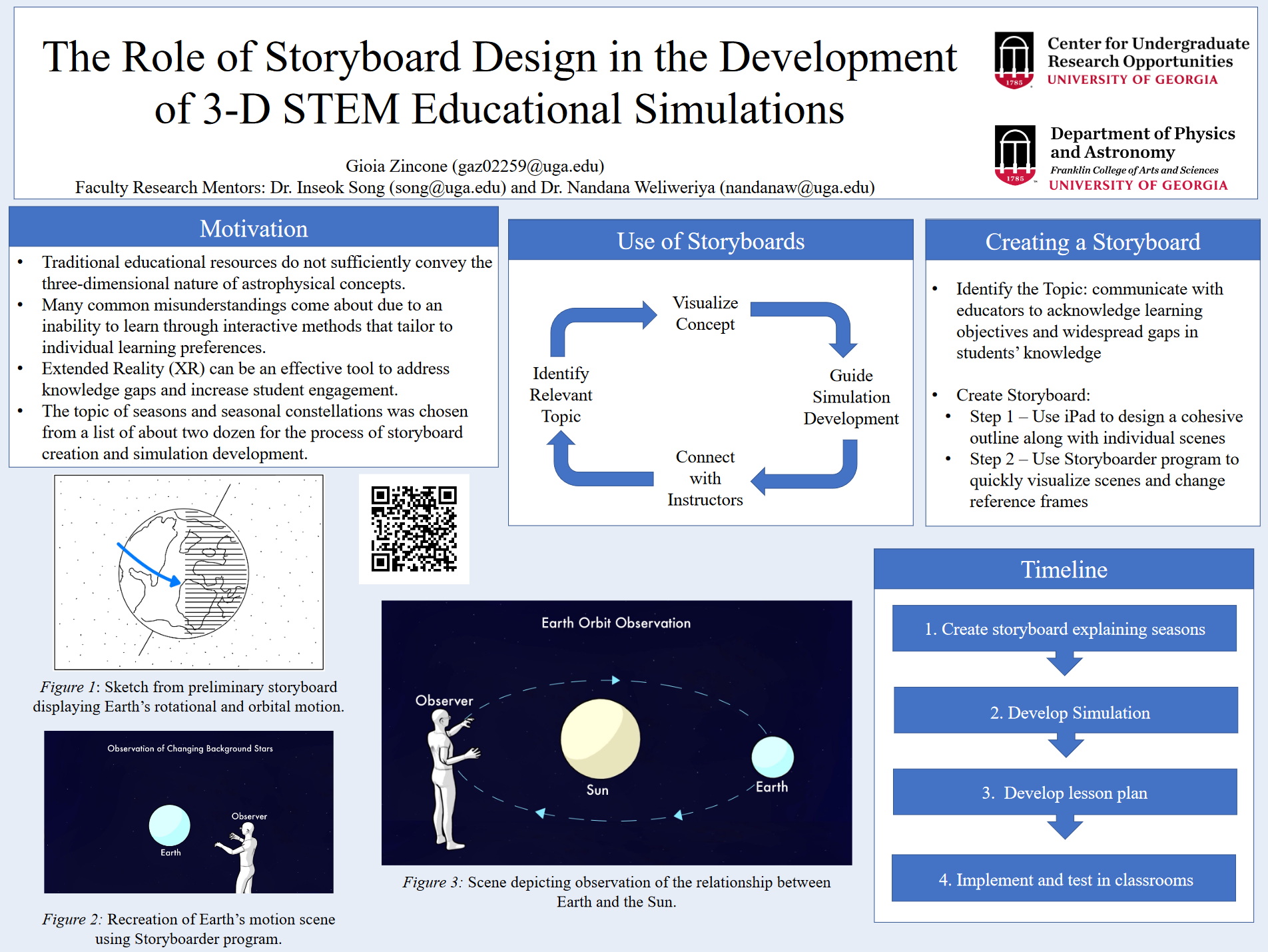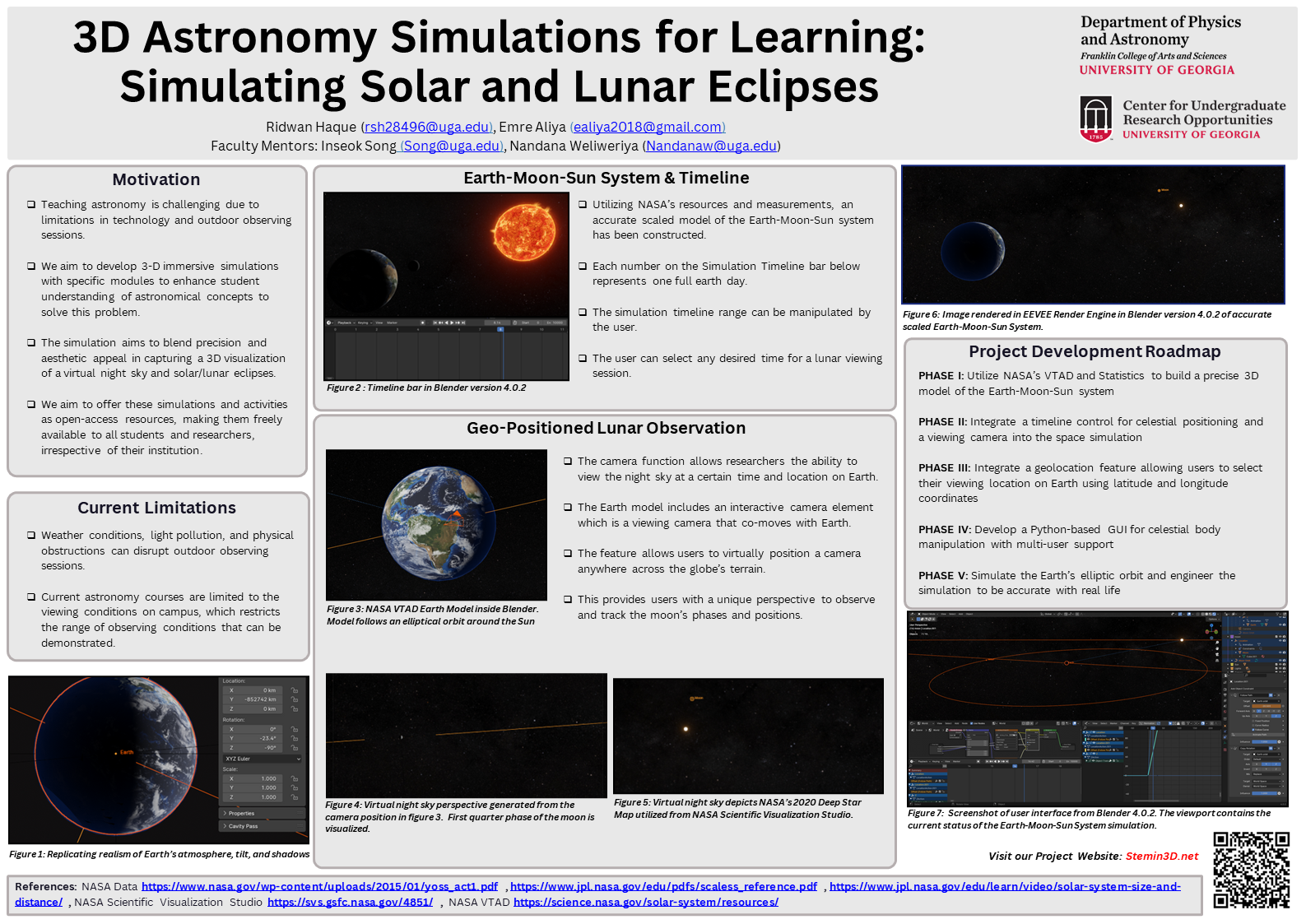 The research project that I am working on, at this moment and in the future, is called STEMin3D. It is a collaborative effort between the UGA Physics & Astronomy Department, College of Engineering, College of Veterinary Medicine, and GSU Physics & Astronomy Department. Spearheaded by Dr. Weliweriya and Dr. Song, its goal is to enhance learning with 3D simulations. We will create both interactive and non-interactive simulations of topics like the diurnal motion of celestial bodies, eclipses, and many others. Though our focus is mainly on astronomical topics at the moment, future plans include other STEM departments. We believe that VR is an emerging technology with the potential to overcome the limitations of traditional labs and drastically improve students' understanding of abstract and esoteric topics.