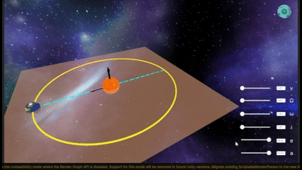 We want to create a model in Unity with user interfaces that can do the following demonstration. This example is from pyorb. We can improve this demonstration by adding (1) a background nightsky map, (2) textured host star and a planet, (3) the semi-parent reference plane, (4) some annotations on the screen such as chosen a, e, i, Omega, omega, and nu, and (5) animation of the planetary motion.
